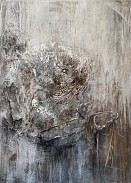 Een abstract werk, opgebouwd uit meerdere lagen acrylverf en textuur.
