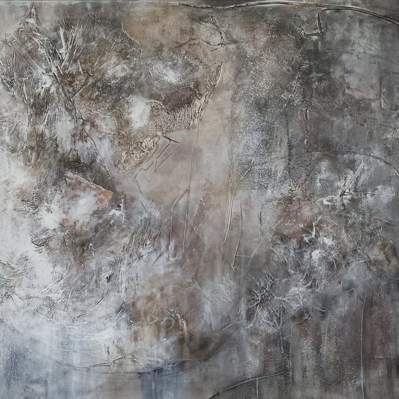Een abstract werk, met veel textuur.