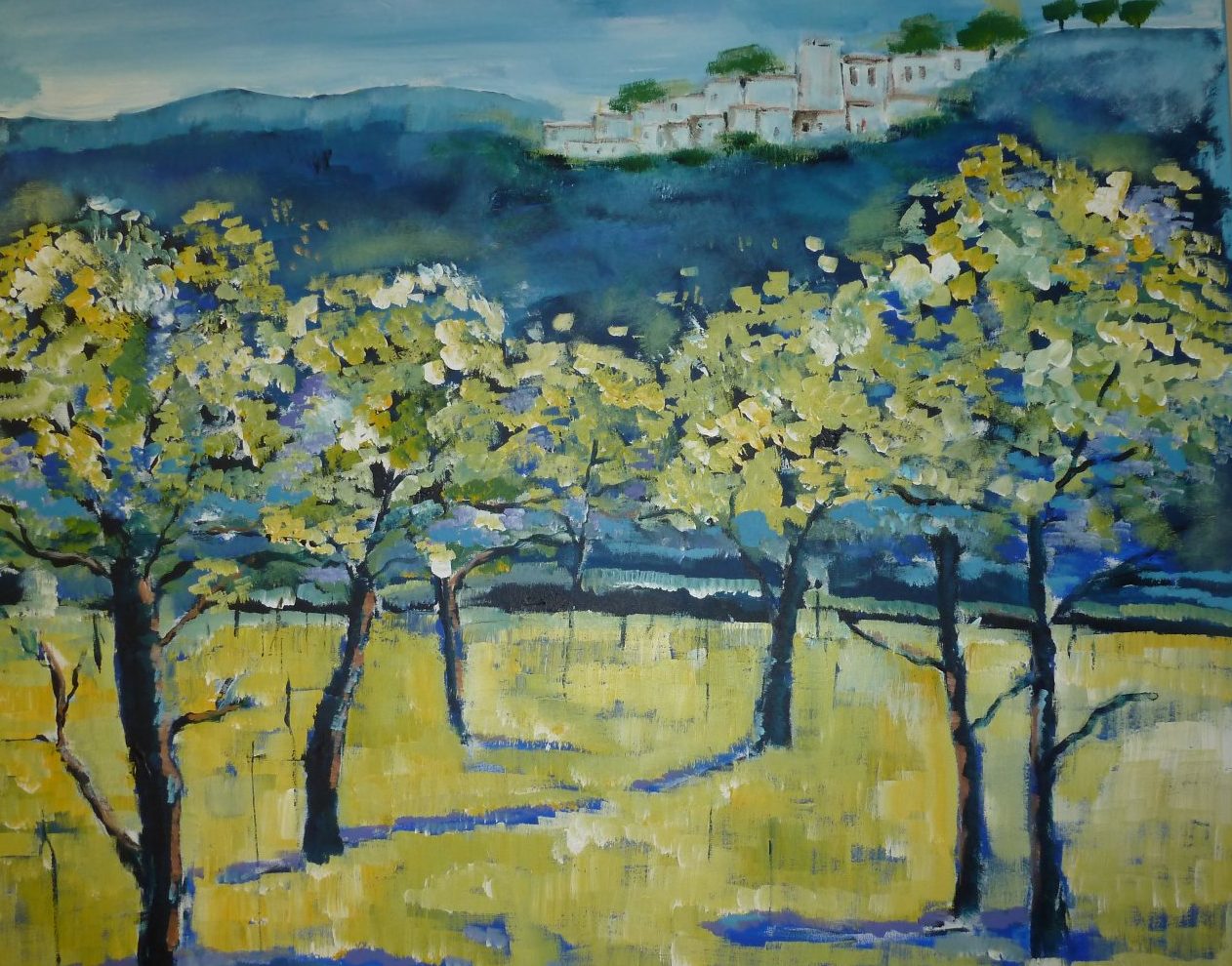 Een globale impressie van het schilderij "Boomgaard" 120x100cm.
