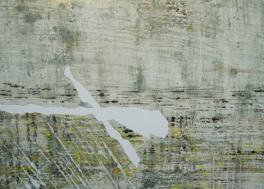 Ingelijst; blank hout, achter glas, met passe-partout, 100 x 80 cm.