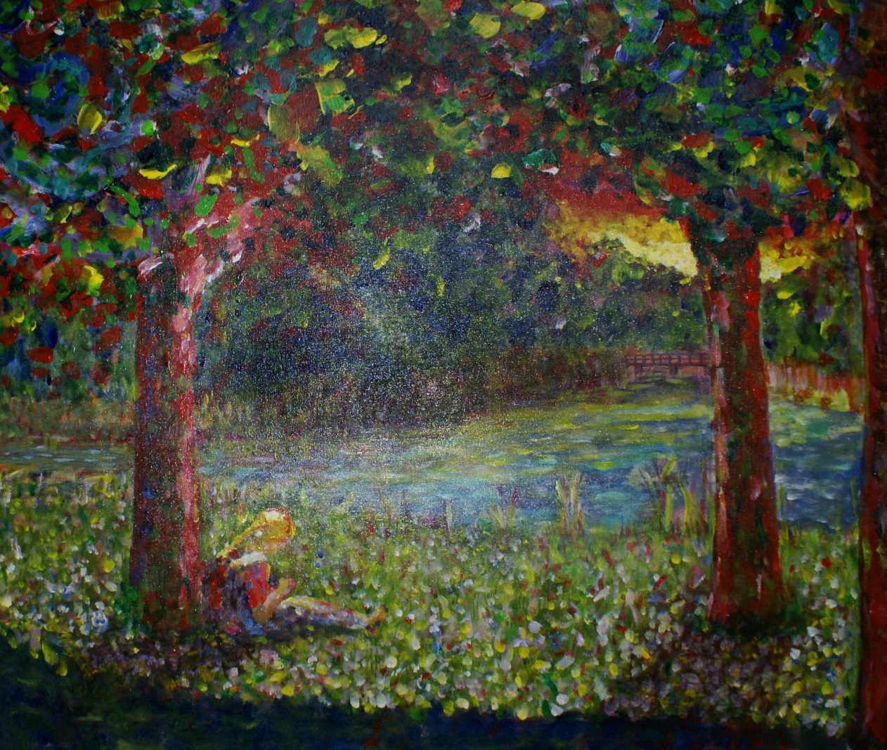 Een globale impressie van het schilderij "Avondzon aan de plas in Almere" 70x60cm.