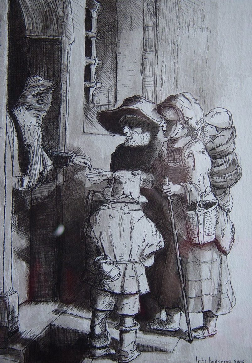 Pentekening naar een ets van Rembrandt, op aquarel papier, inclusief passe-partout en in gelijst in een prachtige klassieke lijst voorzien van kwartsglas. Buitenmaat 50 x 60 cm.