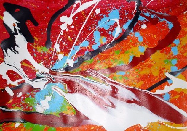 Explosief schilderij, letterlijk, zonder kwast met gooien, spuiten, spetteren, zonder palet te gebruiken.