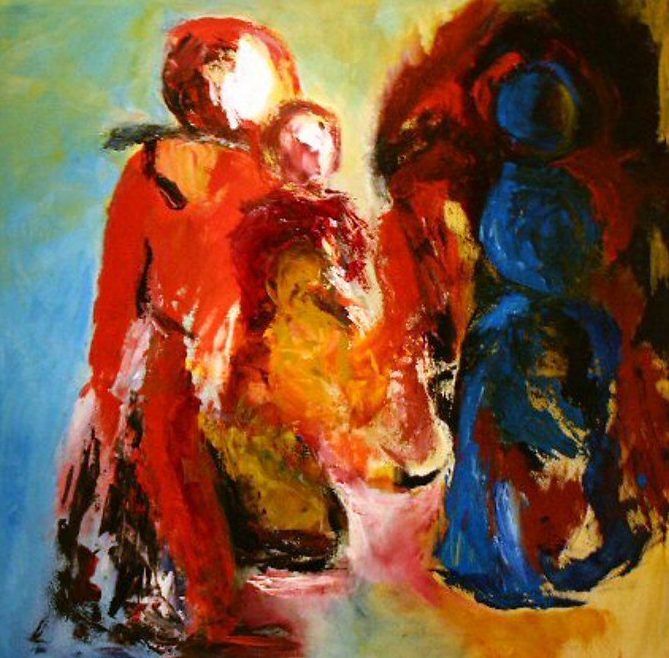 Moeders en kinderen. Kleurig intuïtief schilderij, acryl op doek zonder lijst.