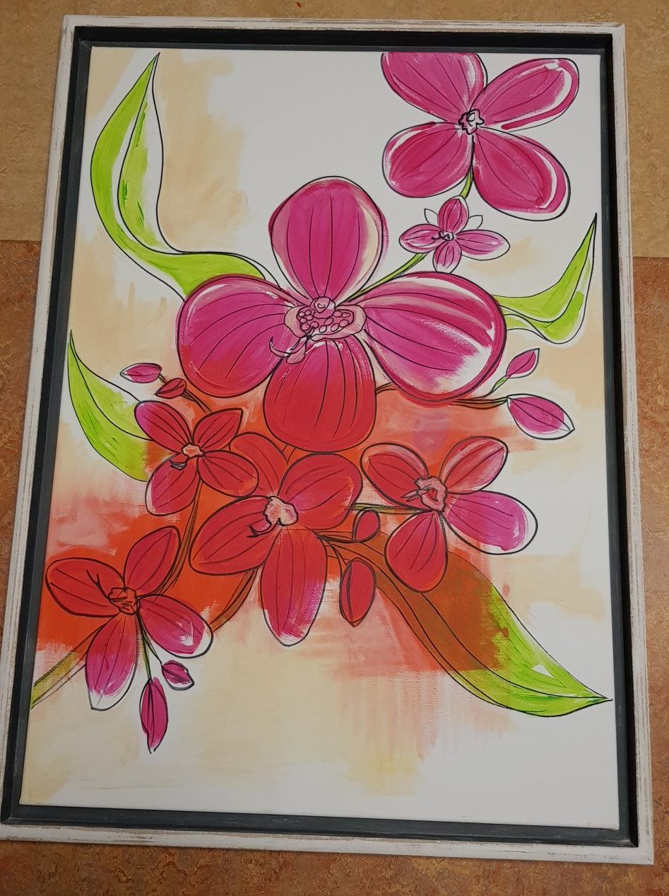Een globale impressie van het schilderij "Untitled flowers in pink" 70x100cm.