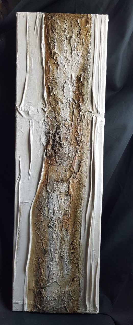 Een heel bijzonder doek is dit, gemaakt met verschillende materialen zoals , stof, tegellijm, craquele, en powertex .acrylverf.