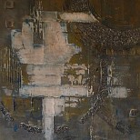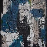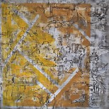 Okergeel schilderij met wat groen- en wat blauw tinten, om de komende winter wat op te vrolijken