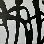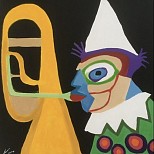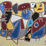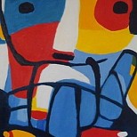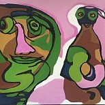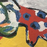 Een "kinderlijk' schilderij in de stijl van de Cobra-beweging eind jaren 50. Acryl op Canvas doek. Afmeting werk 50 x 60 Cm.