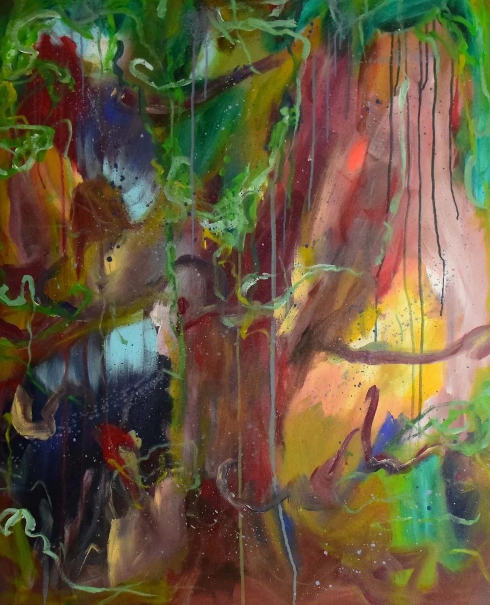 Acrylverf op canvasdoek. Vrolijke en warme compositie met diepte