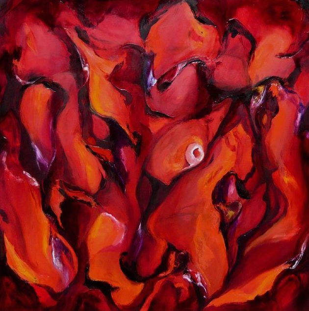 Een globale impressie van het schilderij "Red adventure" 100x100cm.