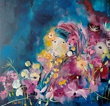 Een globale impressie van het schilderij "Meisje met de parel" 100x100cm.